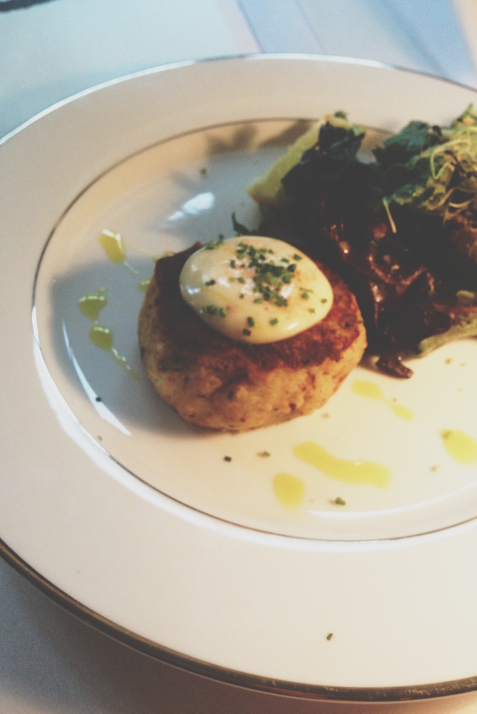 Creamy dollop of prawn bisque cream atop a petite crab tart.
